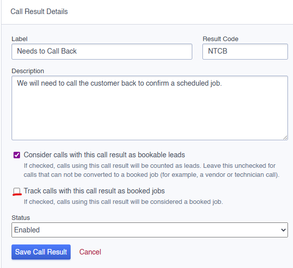 Example this call result does not have the red underlined box checked meaning if you update to this call result it will remove it from the booked count: