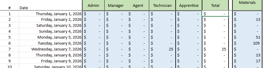 Example: On January 2nd. You had three jobs scheduled and only one job had materials added the material cost for the job is listed at $12.94 but the DMER rounds up to $13.00 for the materials.