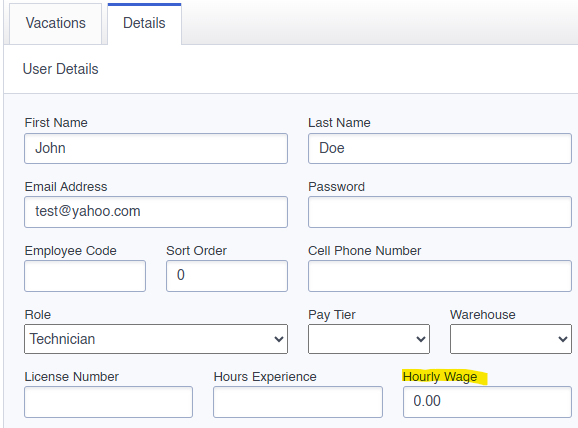 Technician wages can be entered under the user profile.