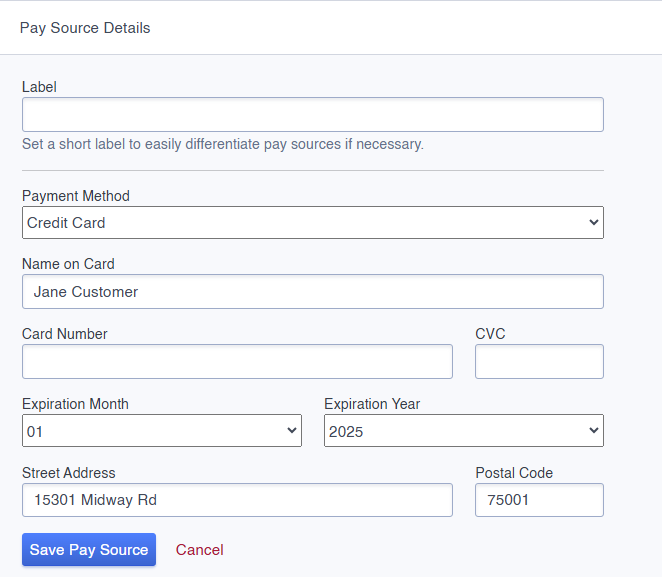 Following these steps ensures the pay source is properly added and each customer can be successfully charged.