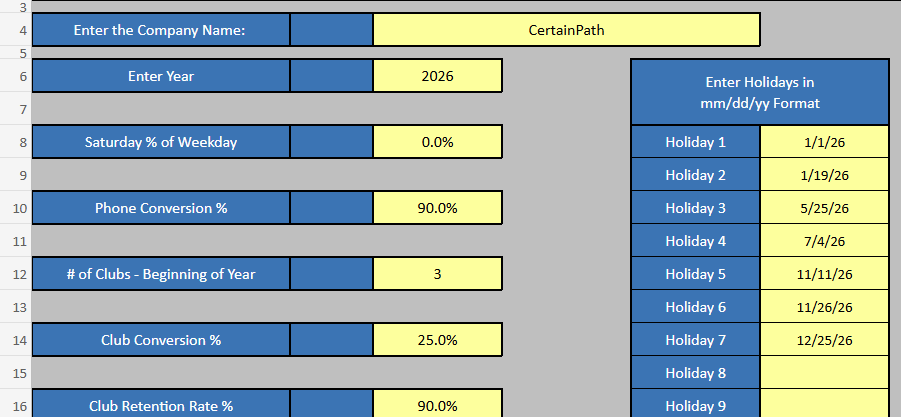 There is a check on the SetUp tab that compares your annual revenue goal to what the file calculates using your performance metrics